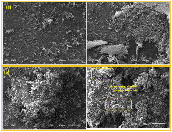 The morphology, structure, and surface state of graphene oxide and PEI/GO were evaluated using SEM analysis. Figure 2a,b displays the representative SEM images of the graphene oxide and PEI/GO, respectively. The SEM images indicate that the graphene oxide was of nanosheet shape with a smooth surface compared to PEI/GO. The SEM images of PEI/GO indicate the formation of polymer branches on the graphene oxide demonstrating that the surfaces of the prepared PEI/GO are quite different from the pure graphene oxide.