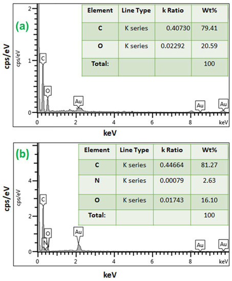 Energy-dispersive X-ray (EDX) spectra of (a) graphene oxide and (b) PEI/GO.