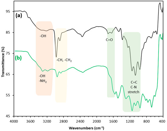 Fourier-transform infrared (FTIR) spectra of (a) graphene oxide and (b) PEI/GO.