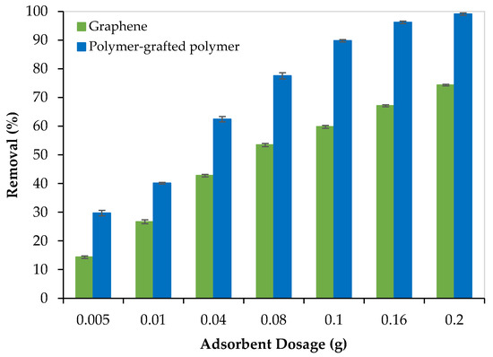 As the adsorbent dosage increased, the adsorption capacity (Pb2+ removal %) increased, and this can be attributed to the increase in the number of active sites. In addition, as presented in Figure 6, PEI/GO showed a better removal performance compared to graphene oxide and this can be credited to the formation of polymeric branches on the graphene oxide surface as illustrated by the SEM images (Figure 2b) and confirmed by the image mapping (Figure 3), EXD (Figure 4b), and FTIR (Figure 5). These formed polymeric chains offered extra adsorption active sites and more affinity to adsorb Pb2+ ions (more details are described in Section 3.5).