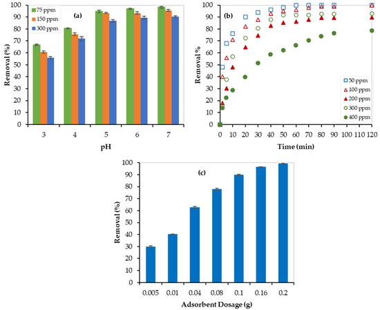 The effect of solution acidity (pH) on the Pb2+ removal by PEI/GO was investigated at 23 °C and 1 atm. Different water solutions with Pb2+ initial concentrations of 75 ppm, 150 ppm, and 300 ppm were treated with 0.1 g PEI/GO at different pH values, and results are presented in Figure 7a. At low pH (acidic solution), the removal % was low and this can be attributed to the protonation of the carbonyl groups and some of the PEI/GO active sites were occupied by the positive H+ rather than the Pb2+ positive ions. However, the removal % of Pb2+ increased as pH increased (i.e., as H+ ion concentrations decreased). At pH = 6, the removal % of Pb2+ reached the maximum at 97%, 94%, and 90% for the solutions of 75, 150, and 300 ppm of Pb2+ ions, respectively. Further increase in the pH value (pH = 7) has no significant increase in the Pb2+ removal %, which can be due to a balance between the reduction in H+ ions and the formation of the OH− ions. While the H+ acts as a competitor for Pb+2, the OH− acts as a competitor for NO32−. With a further increase in pH (>7), the removal % is expected to decrease because of the concentration of the OH− ions and the formation of some water-soluble lead complexes. Therefore, the pH value of 6 was maintained during the next batch of experiments.