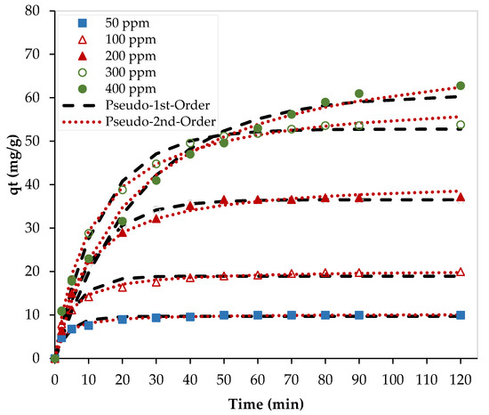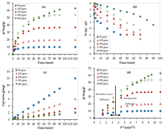 In addition, the linear forms of the pseudo-first- and second-order kinetic models, presented in Table 3, were used to fit the experimental data at different initial Pb2+ concentrations (see Figure 9). Although the values of the determination coefficient (R2) for the pseudo-first-order model were ranging between 0.9391 and 0.9951, they were ranging between 0.9886 and 0.9997 for the pseudo-second-order model. Furthermore, the calculated values of the adsorption capacity by the pseudo-second-order model were closer to the experimental values at low adsorbate concentrations, and the obtained values by the pseudo-first order were closer to the experimental values at high adsorbate concentrations. At low Pb2+ concentrations (50 and 100 ppm), chemical adsorption, involving valance forces between the adsorbate and the adsorbent, was dominating. However, at high Pb2+ concentrations (300 and 400 ppm), physical adsorption with van der Waals forces dominates.