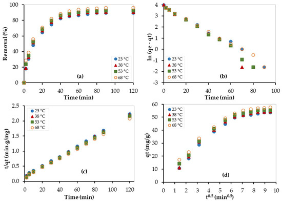 The kinetic study was also performed at 23, 38, 53, and 68 °C, and experimental data were fitted by the above-mentioned kinetic models, as shown in Figure 10. The obtained kinetic parameters are summarized in Table 3. As shown in Figure 10a, the adsorption capacity increased as the temperature increased, and this indicates that the adsorption process is endothermic. In addition, as temperature increased, the experimental data were best fitted with the pseudo-second-order model (see Figure 10b,c) and this implies that the chemisorption process became more dominating at high temperatures. Similarly, as shown in Table 4, the C values are large and thus indicate that the boundary layer diffusion step is the limiting step of the adsorption process. In addition, the values of C almost increased as temperature increased, indicating that the boundary layer diffusion step became more dominant at higher temperatures.