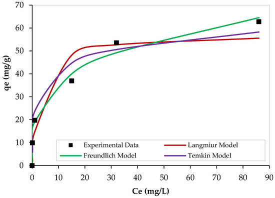 In addition, the experimental data were fitted by the linear forms of the isotherm models and the results are presented in Figure 12. As shown in this figure, the highest value of R2 was obtained for the Freundlich isotherm model (R2 = 0.9932). Therefore, the Pb2+ adsorption onto PEI/GO forms multilayers and is favorable on heterogeneous surfaces of PEI/GO, and the adsorption rate increases as adsorbate concentration increases till reaching equilibrium. The n value (3.65) confirmed the great adsorbent (PEI/GO) affinity for Pb2+ ions.