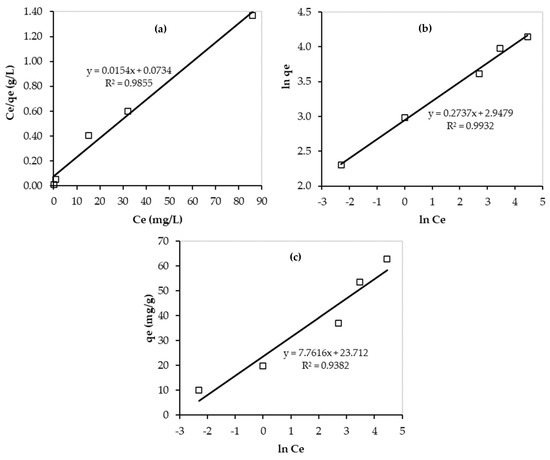 Linear isotherms of Pb2+ adsorption over PEI/GO: (a) Langmuir; (b) Freundlich; and (c) Temkin models. (pH = 6, PEI/GO dosage = 0.1 g, and 23 °C).