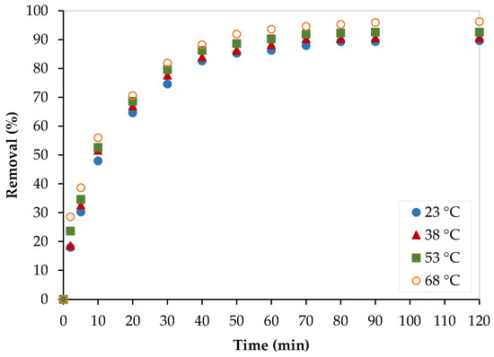 The temperature dependence of the Pb2+ adsorption process over PEI/GO was assessed at four different temperatures (23, 38, 53, and 68 °C), as shown in Figure 13. The Pb2+ removal increased as the temperature increased, which implies the endothermic nature of the process.