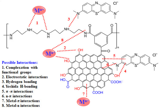 Illustration of possible mechanisms of pollutants–adsorbent interactions for the adsorption of metal ions and organic dye. (Note: some of the repeated or predefined interactions were for simplicity omitted, and M refers to metal ions).