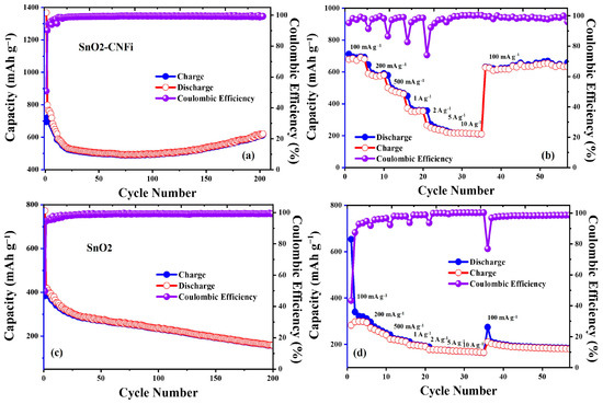 | SnO2-CNFi | 1367.6 mAh g−1 | 50.8% | 200 | 619 mAh g−1 | 99.84% |