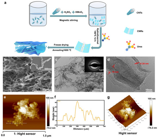 Typically, 1 g of CNTs was suspended in 30 mL of concentrated H2SO4 and then stirred at room temperature for 12 h. A total of 5 g of KMnO4 was gradually added into the mixture with an ice water bath and stirred at room temperature for 1 h. The mixture was moved to an oil bath at 65 °C for 30 min. After that, the solution was quenched in ice water, and 100 mL of ice water and 5 mL of H2O2 (30 wt%) were poured slowly into the mixture. The mixture was centrifuged and washed with HCl (1/10, v/v) and deionized water. The product was lyophilized to obtain the precursor. A total of 0.3 g of the obtained precursor and 9 g of urea were dispersed in 50 mL of deionized water. After sonication and stirring for 30 min, the suspension was transferred into a 200 mL autoclave and heated at 180 °C for 12 h. After cooling down to room temperature, the mixture was washed with deionized water and dried at 60 °C to obtain O-GNRs. Finally, the O-GNRs composite was thermally annealed at 1600 °C for 2 h in a tube furnace under the protection of Ar to obtain GNRs. A schematic diagram of the preparation procedures of the GNRs composite is shown in Figure 1a.