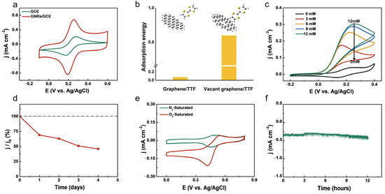 (a) CVs curve of GCE and GNRs/GCE in 0.1 M KCl containing 5 mM [Fe (CN)6]3−/4−. (b) The optimized structures of pristine graphene and vacant graphene adsorbing TTF. (c) CV curves of LOx/TTF/GNRs/GCE in 0.1 M PBS (pH 7.2) containing different concentration of lactate (LA). (d) The current density J is plotted as a function of time, and J0 is defined as the current density on the first day. (e) CVs curves of BOD/ABTS/GNRs biocathode in 0.1 M PBS solution (pH 7.2) under different atmospheres. (f) Chronoamperometry curve of BOD/ABTS/GNRs in O2-saturated 0.1 M PBS solution (pH 7.2) at a bias of 0 V vs. Ag/AgCl.