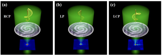 Schematic diagram of multifunctional metasurfaces for realizing non-diffracting beams. (a) Generation of polygonal Bessel vortex beam under RCP incidence. (b) Generation of Airy vortex-like beam under LP incidence. (c) Generation of Airy beam under LCP incidence.