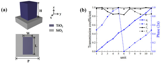 (a) Schematic perspective and top view of the TiO2 unit structure. (b) Corresponding normalized transmission coefficients (black) and phase shifts (blue) for selected 11 units under x-LP and y-LP incidences.
