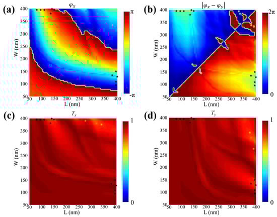 The 11 black dots in Figure 4 correspond to the units in Figure 3b from left to right and from top to bottom. Figure 4a,c depict the relationship between the size (L, W) of units and the phase shift and transmission coefficient under x-LP light, respectively. It can also be seen that the phase retardation can well span the entire 2π range, and the transmittance is always at a high value of more than 80%. Therefore, the desired phase combination can be obtained by rationally choosing the unit size. In addition, the selected units are well satisfied that the phase difference are approximately π under x-LP and y-LP incidence, which can be clearly drawn from Figure 4b. The calculated phase shifts and transmission coefficients of individual TiO2 unit under x-LP and y-LP light incidence are presented in Figure 4d. In a word, the independent regulation of RCP and LCP can be well achieved by all units.