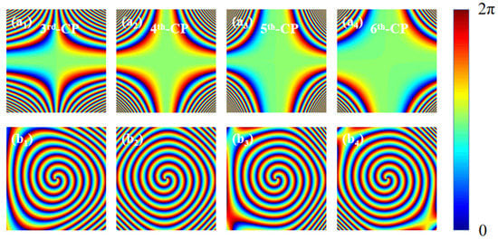 where λ represents the incident wavelength, β represents the angle between the transmitted wave and z-axis (set to 12.7°), l represents the topological charge, the parameter u controls the beam conversion rate and η is an arbitrary real number. It can be seen from Equation (9) that the magnitude of the value of u is affected by the order of CP. Since the designed structure is nanoscale, the value of u will be relatively large. As an example, in the following Figure 5, the generation process of the phase mask composed of the HOCP and the 2nd-order Bessel vortex beam is shown. Figure 5a1–a4 corresponds to the phase masks from the 3rd-order CP to the 6th-order CP, respectively, and Figure 5b1–b4 shows the phase of the 2nd-order Bessel vortex beam after superimposing HOCP in Figure 5a1–a4. It can be clearly seen that the Bessel vortex beam can be shaped into any polygon after adding HOCP, where the number of polygon sides is equal to the order of HOCP. Another way of saying this is that when the order of HOCP is three, four, five and six, the resulting OVB is shaped into triangular, quadrilateral, pentagonal and hexagonal polygons.