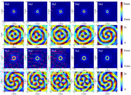 Based on the above theory, considering the influence of p and q values on beam shaping, the xoy plane electric field simulated at the focal position under RCP incidence is shown in Figure 6. Figure 6a1–d1 represents the electric field and phase distribution of the 2nd-order and 4th-order Bessel vortex beams without adding HOCP, respectively. It can be observed that Bessel vortex beams of any order can be well generated. When HOCP is added, the electric field presents a polygonal ring of corresponding order, and the phase presents a polygonal distribution. Among them, some basic properties are the same as the traditional Bessel vortex light, for example: the radius of the beam will increase with the increase in the order of the Bessel vortex beam, and there will be secondary halos of various levels outside the primary halo. From Figure 6b1–b5 and Figure 6d1–d5, it can be clearly known that the adjustment of HOCP is based on the phase. By polygonal shaping the vortex part of the phase mask, the shape of the spatial beam can be changed, which can confirm the numerical results derived in Figure 5. Since the manipulated particle will move in the direction of the energy flow, as long as the values of p and q are controlled according to the desired result, the motion trajectory of the manipulated instance can be accurately determined.