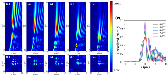 As can be seen from Equation (14), the light field of an Airy beam is affected by m and n. We set m = n = a, where a is an any constant. Corresponding to different a values under LCP incidence, the xoz and yoz electric field distributions and the intensity distributions at the focus position (the dotted line position in Figure 7a1–a5 are shown in Figure 7. Figure 7c shows the intensity distribution of the light field along the x-axis at the focus. With the increase in the value of a, the focal distance will gradually approach the metasurface and the central intensity of the focal position will progressively increase. In other words, the Airy beam becomes more concentrated as the value of a increases.