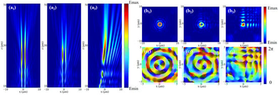 Next, according to the focus position of the Bessel vortex beam, we correspondingly select the Airy beam with a = 16 × 10−7. Firstly, considering the case of the general Bessel vortex beam, when LP light is incident, the light fields generated by the incident LCP and RCP will act simultaneously. We slightly adjusted the output intensity of the two beams in order to achieve better fusion under the incidence of LP light. Additionally, we adjust the two light fields to focus on the same plane, and there will be an interaction between the two light fields, resulting in an Airy vortex-like beam, which can be verified by Figure 8. The light field and phase distribution of the xoy cross-section at the focal position are shown in Figure 8b,c. It can be found that after the superposition of the light fields, the central spot of the Airy beam is well integrated into the vortex part, forming a series of concentric rings similar to the Airy vortex beam, and its vortex state can be further confirmed in the phase field. The beam combines the singularity properties of vortices and the self-healing properties of Airy beams, which makes it promising for future laser applications.