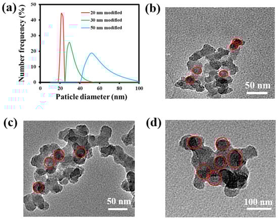 (a) DLS analysis of modified nanoparticles. (b) TEM images of 20 nm modified nanoparticles, (c) 30 nm modified nanoparticles, and (d) 50 nm modified nanoparticles.