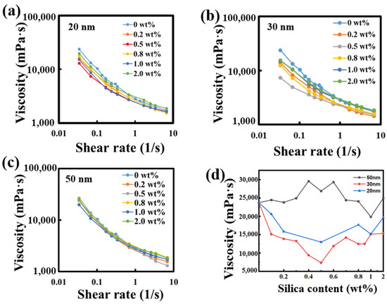 Relationship between the rheological properties of PVDF/SiO2 and the content of nanoparticles with different diameters. (a) PVDF/20 nm SiO2; (b) PVDF/30 nm SiO2; (c) PVDF/50 nm SiO2. (d) Viscosity variation with different contents and diameters of nano-SiO2 at the shear rate of 0.034 s−1.
