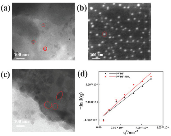 The dispersion state of nano-silica in the PVDF matrix. (a) TEM images of 20 nm SiO2 (b) TEM-HADDF image of 30 nm SiO2. (c) TEM images of 50 nm SiO2; (d) Linear fitting of SLS results of pure PVDF and PVDF/0.5 wt% 30 nm SiO2 nanocomposites.