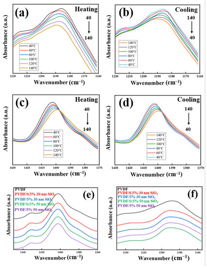 Intermolecular forces are an essential factor affecting the viscosity of polar polymers. For polar PVDF, the fewer the number of intramolecular and intermolecular hydrogen bonds, the lower the viscosity. Therefore, we explored the effect of nanoparticles on the number of hydrogen bonds in the PVDF/SiO2 composite, to explain why the addition of nanoparticles led to a reduction in PVDF viscosity. Temperature-dependent FTIR was applied, to study the change in the infrared vibration peak during the heating and cooling process of the sample from 40 °C to 140 °C. Figure 4a–d show the heating and cooling infrared spectra of pure PVDF. The bending vibration peak of –CH2– in PVDF should be located at the position of 1376~1380 cm−1 [43,44], but it is blue-shifted, due to hydrogen bonding, and hence it is located at 1402 cm−1 at 40 °C. However, this peak eventually moves to 1396 cm−1 during the heating process, which suggests that the bending vibrational peaks of –CH2– tend to be red-shifted as the hydrogen bonds open. At the same time, the stretching vibration peak of –CF2–, located at 1183 cm−1 [45], gradually blue-shifts to 1192 cm−1 with the heating process, which indicates that this peak also undergoes a red-shift in the process of hydrogen bond opening. Figure 4e,f is the IR spectra after adding particles of different diameters. Even if the number of nanoparticles of different diameters is as high as 5 wt%, the peaks at 1402 cm−1 and 1183 cm−1 do not shift, proving that the addition of nanoparticles does not destroy the hydrogen bonds in the system.
