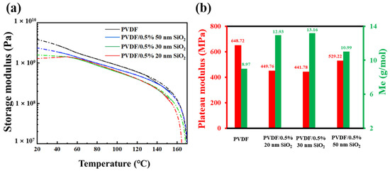 (a) The storage modulus of PVDF and PVDF/SiO2 nanocomposites varies with temperature at 1 Hz. (b) Plateau modulus of PVDF and PVDF/ SiO2 nanocomposites.