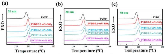 The heat flow curve of PVDF/SiO2 nanocomposites with different particle sizes and contents during the cooling process. (a) 20 nm (b) 30 nm (c) 50 nm.