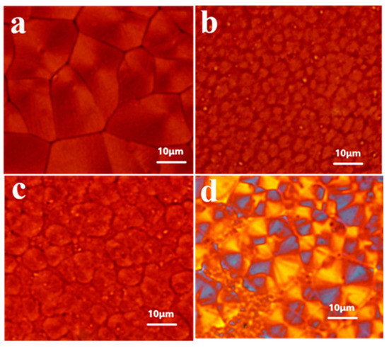 Isothermal crystallization morphology of (a) pure PVDF, (b) PVDF/20 nm 0.5 wt% SiO2, (c) PVDF/30 nm 0.5 wt% SiO2, and (d) PVDF/50 nm 0.5 wt% SiO2.