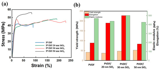 (a) Stress–strain curves of pure PVDF and PVDF/SiO2 nanocomposites. (b) The yield strength, elastic modulus, and elongation of PVDF/0.5 wt% SiO2, with different particle diameters.