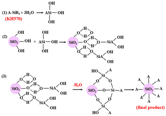 Nano-silica was surface modified by KH570, and the mechanism is shown as Scheme 1 [35]. The chemical formula is CH2=C(CH3)COO(CH2)Si(OCH3)3 and its reaction with nano-SiO2 consists of three steps: (1) the –R group attached to the silicon atom hydrolyzes, to form Si–OH oligosiloxane; (2) the Si–OH in oligosiloxane forms a hydrogen bond with the –OH on the surface of nano-SiO2; (3) a covalent bond with SiO2 is formed, along with the dehydration reaction during the heating process.