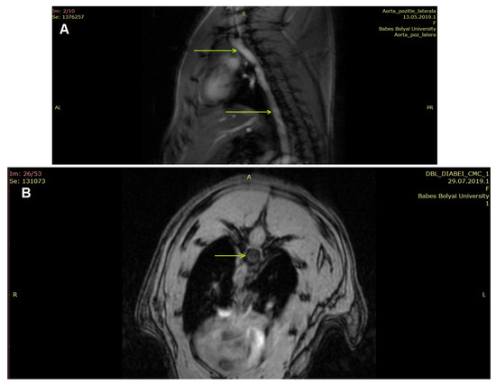 Pioglitazone administration had similar effects to the insulin treatment. The ultrasound examination of the rats’ aorta treated with this antidiabetic medication that proved to also have antioxidant and anti-inflammatory effects [11,27], had the most significant vasodilation with the lowest significant blood flow velocity, compared to the rats in the negative control group. These modifications were confirmed with the MRI investigation that recorded the highest descending aorta volume (Figure 7). These findings were concordant with the study performed on persons with impaired glucose regulation by Yu et al., which showed the increase in nitric oxide levels after the administration of pioglitazone at a dose of 15 mg/day for 12 weeks [28]. The vasodilation may be also explained by the opening effect of pioglitazone on the smooth muscle KV (voltage-dependent K+) and/or KIR (inward rectifier K+) channels that was reported by Nomura et al. in their study on the isolated rat aorta [29]. The TEM investigation on the aorta wall of the Pioglitazone group showed similar effects as were recorded in the Insulin group, no clots inside the endothelial layer but Weibel–Palade bodies inside the endothelial cells, the sign of DM modifications of these cells toward a secretory phenotype that leads to atheroma development, as Toma et al. mentioned in their review [30].