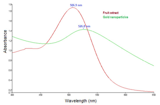 UV-Vis spectroscopy was used to confirm the formation of the gold nanoparticles through the reduction in gold ions by the bioactive compounds from the Cornelian cherry extract. The UV-Vis spectrum of the Cornelian cherry fruit extract (Figure 3) exhibited a maximum at 507 nm, which is the specific λmax for anthocyanin compounds. In the spectrum of the colloidal gold solution, a maximum at 527 nm could be observed, which is the characteristic value for the surface plasmon resonance of metallic gold [17,18].
