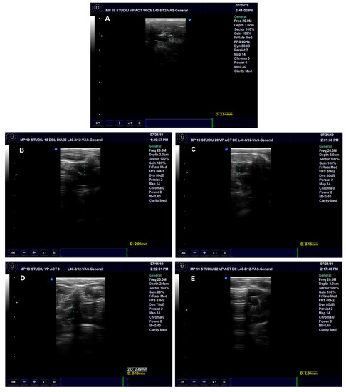 Ultrasound examination of the descending aorta diameter in rats with 9 months of HFD and the last month with experimental-induced diabetes mellitus and treatment: CMC (carboxymethylcellulose) group (A), Insulin group (B), Pioglitazone group (C), AuNPsCM (gold nanoparticles functionalized with Cornus mas L. extract) group (D) and CM (Cornus mas) group (E).
