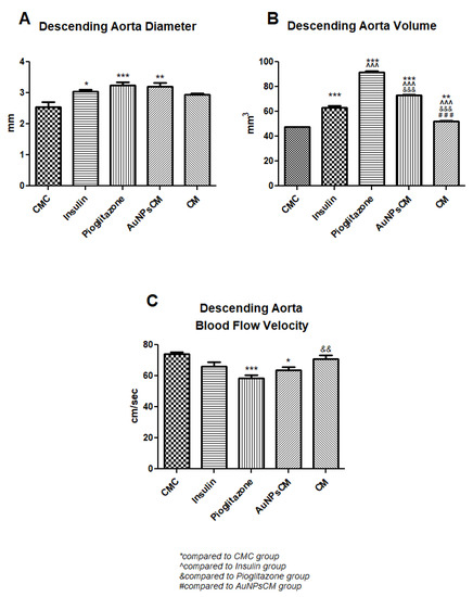 Descending aorta variations of diameter (A), volume (B) and blood flow velocity (C) in rats with 9 months of HFD and the last month with experimental-induced diabetes mellitus and treatment: CMC (carboxymethylcellulose), insulin, pioglitazone, AuNPsCM (gold nanoparticles functionalized with Cornus mas L. extract) or CM (Cornus mas). The parameters were expressed as means ± SD (* p < 0.05, ** p < 0.01, *** p < 0.001 compared to CMC group; ˆˆˆ p < 0.001 compared to Insulin group; && p < 0.01, &&& p < 0.001 compared to Pioglitazone group; ### p < 0.001 compared to AuNPsCM group).