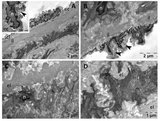 TEM investigation of the descending aorta in rats with HFD for 9 months; the last month with experimental-induced diabetes mellitus and oral gavage pioglitazone administration showed modified ultrastructure: intima of different thickness, with infiltrated macrophages and prominent endothelial cells containing vesicles of transcytosis, large vacuoles and many Weibel–Palade bodies (A,B); media with vacuolated smooth muscle cells, and heterogeneous extracellular matrix (C,D) (arrowhead, vesicles of transcytosis; ec, endothelial cell; el, elastic lamina; il, inner elastic lamina; g, glycogen; m, mitochondria; ma, macrophage; n, nucleus; scl, subendothelial connective layer; smc, smooth muscle cell; v, vacuole, wp, Weibel–Palade bodies).