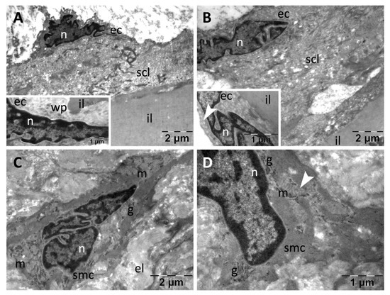 TEM investigation of the descending aorta in rats with HFD for 9 months; the last month with experimental-induced diabetes mellitus and subcutaneous administration of insulin showed altered ultrastructure: thinned intima (A,C), with large vacuoles (C) and endothelial cells removed from the subendothelial layer (D), and a subendothelial connective layer with a heterogeneous structure (A–D); smooth muscle cells with cytoplasmic vacuolations (A,B), and heterogeneous extracellular matrix with rarefied areas in media (A–D) (bp, blood platelets; ec, endothelial cell; il, inner elastic lamina; g, glycogen; m, mitochondria; ma, macrophage; n, nucleus; scl, subendothelial connective layer; smc, smooth muscle cell; v, vacuole).