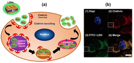 Uptake pathway of layered double hydroxides (LDHs) into cells. (a) A representative process of clathrin-mediated endocytosis (b) Confocal microscopy, which includes the colocalization of fluorescein 5′-isothiocyanate (FITC)-LDH and clathrin in MNNG/HOS cells (involving the localization of (1) the nucleus, (2) clathrin, and (3) FITC-LDH in MNNG/HOS cells, as shown in (4) the merged image). Cells were incubated with FITC-LDH for 2 h, treated with clathrin antibodies, and stained by Texas Red and 4′,6-diamidino-2-phenylindole. Scale bar = 10 µm. (Reprinted with permission from Ref. [31], Copyright 2006, the American Chemical Society.).