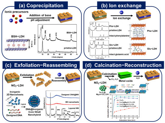 On the basis of their anionic exchange capacity, LDHs have gained interest as a reservoir for negatively charged bioactive compounds. By synthetically manipulating the content and structure of the LDH, it may be possible to produce bio-applicable intercalating moieties between the layers for various biomedical applications. Several chemical methods such as coprecipitation [1,2,33,34,35,36], ion exchange [3,37,38,39], exfoliation-reassembling [39,40,41], and calcination–reconstruction [10,35,42,43,44,45] can be used for lattice engineering to prepare biofunctional LDH nanohybrid materials, as shown in Figure 3 [46,47]. The guest species are accommodated within the interlayers of LDHs through electrostatic interactions, hydrogen-bonding linkages, and van der Waals forces between the guest species and the hydroxyl groups of LDH layers, as well as interlayer anionic and water molecules [21,30]. Therefore, intercalative routes are stabilized, and bio-applicable molecule–LDH nanohybrids can be synthesized and stabilized via various weak interactions.