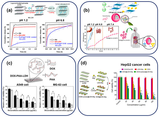 Several recent studies have analyzed and enhanced the LDH-based delivery of therapeutic molecules [5,53], anti-inflammatory drugs [54,55], anticancer drugs [27,56,57,58,59,60], and peptide hormones [61] by improving the drug-release property of LDHs by modification via intercalation, absorption, and other methods. For example, a publication reported the intercalation of nicotinic acid (NA) in LDH interlayers [5]. NA, with low bioavailability, is one of the oldest and most widely used hypolipidemic drugs; however, the rapid release of NA causes undesirable side effects. To enable the gradual release of NA, it has been encapsulated in LDH and coated with Eudragit® S100 (an FDA-approved enteric coating agent that only dissolves under basic conditions, such as those present in the intestine). To form Eudragit® S100-coated NA-LDH, NA intercalated in LDH (labeled NA-LDH) is synthesized by coprecipitation and spray-dried with Eudragit® S100. As shown in Figure 4a, the concentration of NA increases rapidly within the first few minutes in a simulated gastric solution (pH 1.2), indicating rapid drug release by intact NA and NA-LDH. In contrast, in the coated sample, Eudragit® S100 hinders LDH degradation by protonating its surface −OH groups under acidic conditions. Thus, in intestinal fluid, intact NA and NA-LDH exhibit the immediate release of NA, while the drug release is delayed in Eudragit® S100-coated NA-LDH samples. Eudragit® S100, an anionic polymer, replaces the encapsulated molecule (NA) efficiently by an ion-exchange reaction, facilitating the expansion of the LDH interlayer-space in neutral pH. Thus, it enables the construction of a controllable DDS, slowing the release of NA, alleviating its undesirable side effects, and enhancing its bioavailability. Starch [27] and alginate [61] pH-dependent coating systems have also been reported.