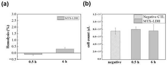 Oh et al. generated LDH nanoparticles intercalated with MTX using the ion exchange approach to address the safety and stability of MTX-LDH in blood vessel settings [66]. Before the in-vivo study, colloidal characteristics were examined by measuring the zeta potential and hydrodynamic diameter of MTX-LDH under simulated plasma conditions. At high doses, MTX is known to reduce the number of red blood cells significantly, resulting in hemolytic anemia. However, the suggested MTX-LDH exhibited almost no toxicity in blood cells even at high concentrations of 7.9 × 106 and 7.6 × 106 /µL, respectively, by confirming the degree of hemolysis and red blood cell number counting assay after 0.5 h and 6 h of intravenous injection to a Balb/c mouse in Figure 5a,b.