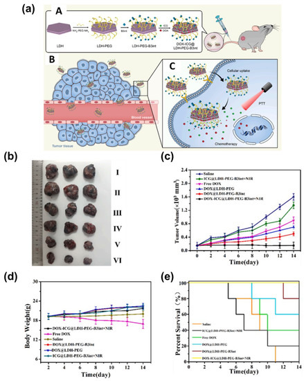 Figure 6a shows the results of a similar study by Zhu’s group, which describes a novel LDH-based multifunctional nanoplatform for co-delivery of anticancer medication, DOX and ICG as a synergistic chemotherapy, in addition to PTT [72]. Notably, arginine-tryptophan-(D-arginine)-asparagine-arginine (B3int) can target cancer cells and enhance the entry of nanomaterials and B3int into the tumor zone. Utilizing surface adsorption to load both molecules, 808 nm-irradiated DOX-ICG@LDH-poly ethylene glycol (PEG)-B3int demonstrated superior tumor growth inhibition compared to saline or free DOX in a mouse model injected with murine melanoma cells. The high biocompatibility and safety of LDHs as a nanocarrier was demonstrated by monitoring body weight and the percentage of mice that survived the observation period (Figure 6b–e).