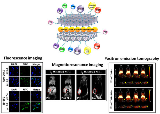 Typically, PET is conducted after intravenously injecting a small quantity of radioactive tracers, such as the positron-emitting isotopes 11C [106,107], 18F [108,109], 68Ga [110], and 13N [106] that are commonly used for in-vivo analysis, into the system. Numerous studies have combined these radioisotopes with metal oxides, dendrimers, chelators, liposomes, and layered compounds [111,112,113]. Typically, 18F-fluorodeoxyglucose (FDG), 11C-methionine (MET), and 13N-ammoniasome (NH3), with one -OH replaced by an isotope, are used for PET. However, systems with 18F and 68Ga have short half-lives, making them unsuitable for in-vivo studies; moreover, the limited evaluation of brain tumors in FDG-PEG and MET systems could generate high-intensity signals for non-tumor lesions.