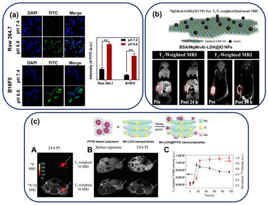 (a) Uptake of Cu-LDH@PAMA/DMMA by B16F0 and RAW 264.7 cells. CLSM images of RAW 264.7 cells and B16F0 cancer cells and their mean fluorescence intensities via flow cytometric analysis after treatment with Cu-LDH@PAMA/DMMA in media with pH 7.4 and 6.8 at 37 °C for 4 h; ** p < 0.01. (Reprinted with permission from Ref. [78], Copyright 2021, the American Chemical Society) (b) T1- and T2-weighted MRI of breast-tumor-bearing mice before and after intratumoral injections of BSA/MgMnAl-LDH@IO NPs. (Reprinted with permission from Ref. [79], Copyright 2019, the American Chemical Society) (c) Schematic illustration of the synthetic procedure of Mn-LDH@PFPE nanoparticles and analyzing their utility for the specific imaging of cancer using a mouse subcutaneous MDA-MB-468 tumor model. For each mouse, 200 μL of an Mn-LDH@PFPE PBS solution (1.8 mmol fluorine per kg = 400 mg per kg or 8 mg per mouse) was injected intravenously through the tail vein (n = 3). A. 19F MRI images (at 9.4 T) of the tumor-bearing mice before and after (24 h PI) intravenous injection of Mn-LDH@PFPE nanoparticles. B. 1H T1- and T2-weighted MRI images, 24 h after injecting Mn-LDH@PFPE nanoparticles. Acquisition times for 1H T1- and T2-weighted MRIs are 1 min 42 s and 1 min 19 s, respectively. The white arrows in (c) A and B indicate tumor sites. C. Changes in T1-weighted 1H and 19F MRI signal intensities in the tumor region after injecting Mn-LDH@PFPE nanoparticles. Data in C indicate mean ± standard deviation (SD) values. (Reprinted with permission from Ref. [90], Copyright 2019, John Wiley & Sons Inc.).