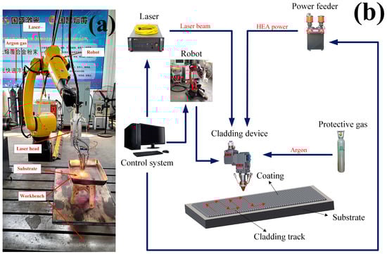 In this experiment, a high-speed GS-CW-6000G-91-202 fiber laser made by Shanxi Guosheng Laser Technology Company was used to process the single and multi-channel samples of high entropy alloy coating []. Coaxial powder feeding processing was adopted, and argon gas was used as the protective gas. The process parameters were optimized by the orthogonal test, and the specific values are shown in Table 2 [,,,]. The laser cladding equipment [] and system components are shown in Figure 1.