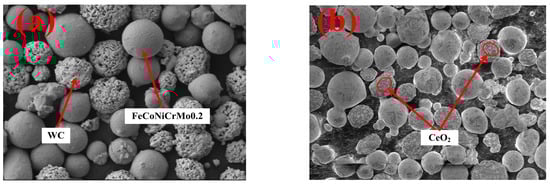 After comprehensive consideration of cladding morphology, dilution rate, microhardness, friction coefficient, and other indicators, it was finally determined that FeCoNiCrMo0.2 + 32%WC + 2%CeO2 was the best composite cladding layer. The SEM morphology of the powders is shown in Figure 2 [,,].