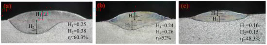 Cross-sectional morphology of the three coatings: (a) FeCoNiCrMo0.2 coating; (b) FeCoNiCrMo0.2 + 32%WC coating; (c) FeCoNiCrMo0.2 + 32%WC + 2%CeO2 coating.