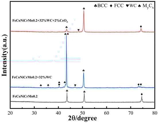 Based on these, two kinds of composite cladding layers, namely, FeCoNiCrMo0.2 + WC and FeCoNiCrMo0.2 + WC + CeO2, were prepared on the surface of 316L stainless steel by laser cladding technology using mechanical self-blending powder as raw materials []. The effects of WC and CeO2 on the phase structure, microstructure, and microhardness of the cladding layer of high entropy alloy were studied to provide theoretical reference and experimental examples for subsequent research on the preparation process of improving the properties of high entropy alloy.