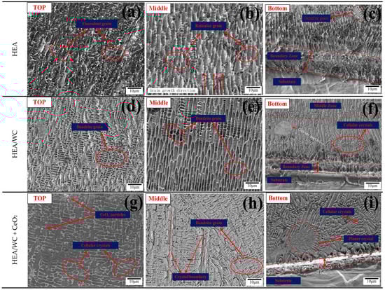 As seen in Figure 5g–i, the addition of CeO2 further refined the grain structure of the coating, and the grain structure at the top and bottom turned into cellular crystals with multi-directional grain growth. This is because, compared with Fe, Co, and other elemental elements in the HEA/WC coating, the Ce atom has high chemical activity and a relatively large atomic radius, which tends to cause lattice distortion and increases the free energy of the system. In addition, the Ce atom in a molten pool does not exist in the form of elemental elements, but will it form finer CeOx particles as nucleating points and enrich at grain boundaries. The Ce gathered at grain boundaries inhibits the further growth of grains and has a pinning effect on the movement between grain and the phase interface, thus refining the microstructure. This is evidenced by the significant change of the porous particle size, from large particles from the top of the HEA/WC coating in Figure 5d to the fine particles in Figure 5g. As can be seen from Figure 5h, the grain structure in the middle transformed from dendritic to cellular, and the grain boundary was more obvious and the grain distribution more dense []. This is because the addition of CeO2 can inhibit the formation of many metal compounds and carbides produced by the addition of WC, which affects the microstructure of the coating. As shown in Figure 5i, at the bottom of the coating, planar crystals could be found, with a large temperature difference between the coating and the 316L substrate, forming finer cellular crystals under directional solidification.
