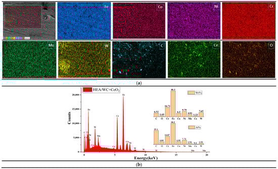 (a). The energy spectrum analysis results of each element of the HEA/WC + CeO2 coating. (b). The distribution of each element of the HEA/WC + CeO2 coating.
