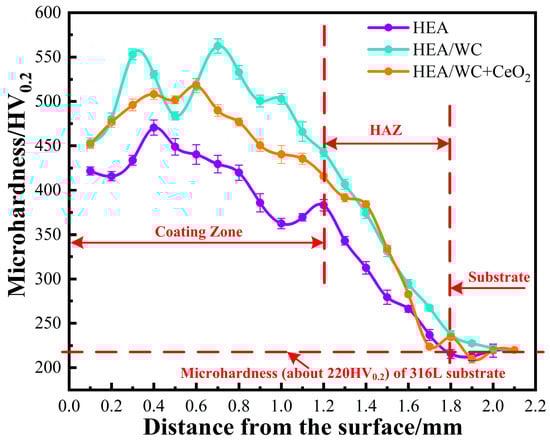 Figure 8 depicts the microhardness distribution curves for the three different coatings. As can be seen from the figure, the level of microhardness of the coating was clearly different in the coating zone, heat affected zone, and the substrate. In the coating area, the maximum microhardness of the HEA coating was 470.6 HV0.2, while the maximum hardness values of the HEA/WC and HEA/WC + CeO2 coatings were 562.47 HV0.2 and 517.76 HV0.2, respectively, an increase of about 100 HV0.2 and 50 HV0.2, respectively. In the HAZ (heat affected zone), the microhardness in this area decreased significantly, as the 316L substrate was diluted into each coating, but the coating maintained its properties. As a result, the heat affected zone was harder than the 316L substrate. As can be seen from Figure 8, the hardness of the 316L substrate was about 220 HV0.2, and the hardness of the HEA/WC coating was about 2.6 times that of 316L and 1.2 times that of the HEA coating. This suggests that WC particles can significantly improve the microhardness of HEA coatings for the purpose of surface strengthening.